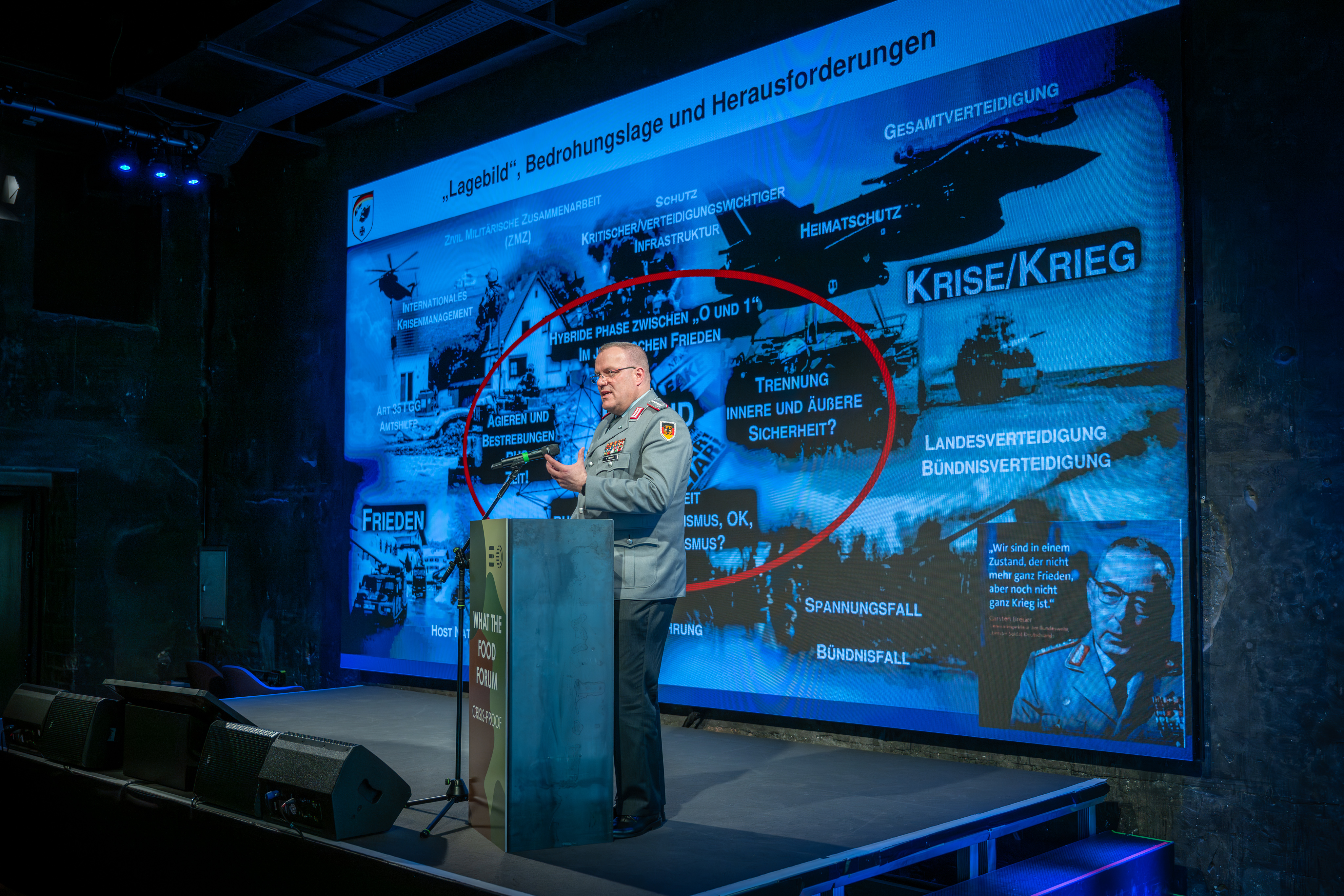 Oberst Armin Schaus verdeutlichte, wie konkret Bedrohungen bereits heute sind. Nach Sabotage an der Stromversorgung in Berlin kam es kurzfristig zu leeren Regalen in Teilen der Stadt – ein Beispiel für die direkte Wirkung auf Lieferketten.