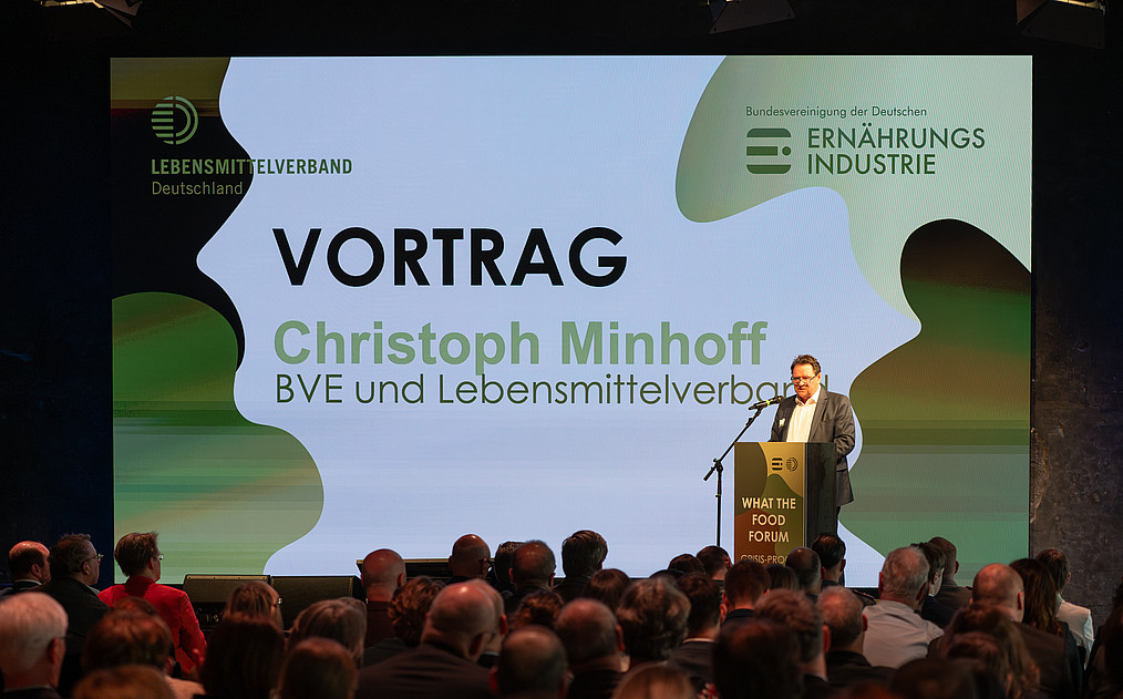 Christoph Minhoff, Hauptgeschäftsführer des Lebensmittelverbandes Deutschland und der BVE, eröffnete mit einer Einordnung der aktuellen Lage. „Wenn ich sage, Krise ist das Neue Normal, dann schaue ich eben nicht nur auf die Kriegsszenarien, sondern auf Cyberattacken, Sabotageaktionen, Pandemien, Boykotte, Sanktionen, Lieferkettenstörungen. Alles das sind Krisen, die es zu bewältigen gibt.”